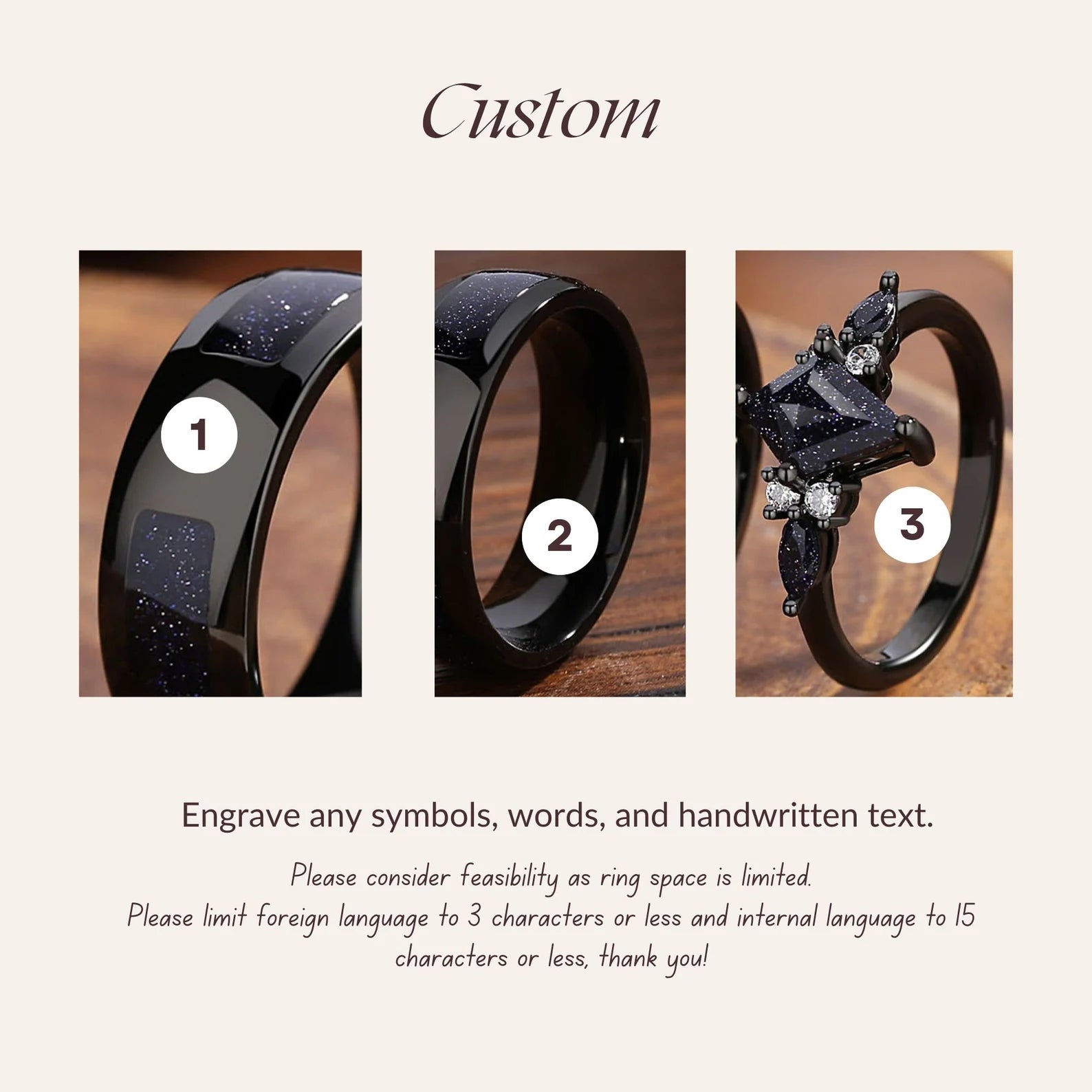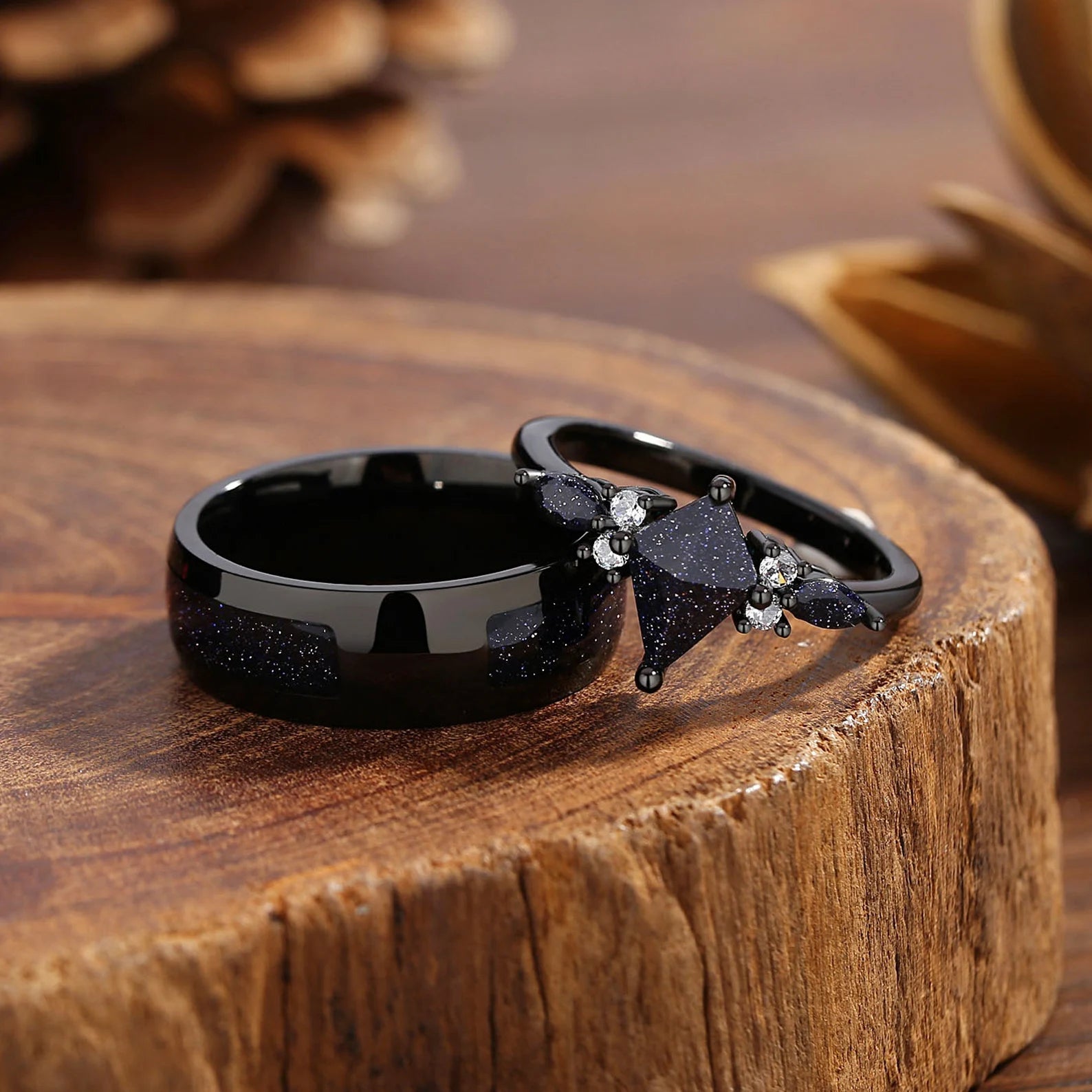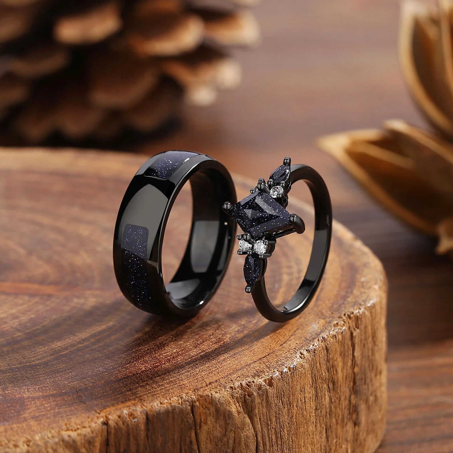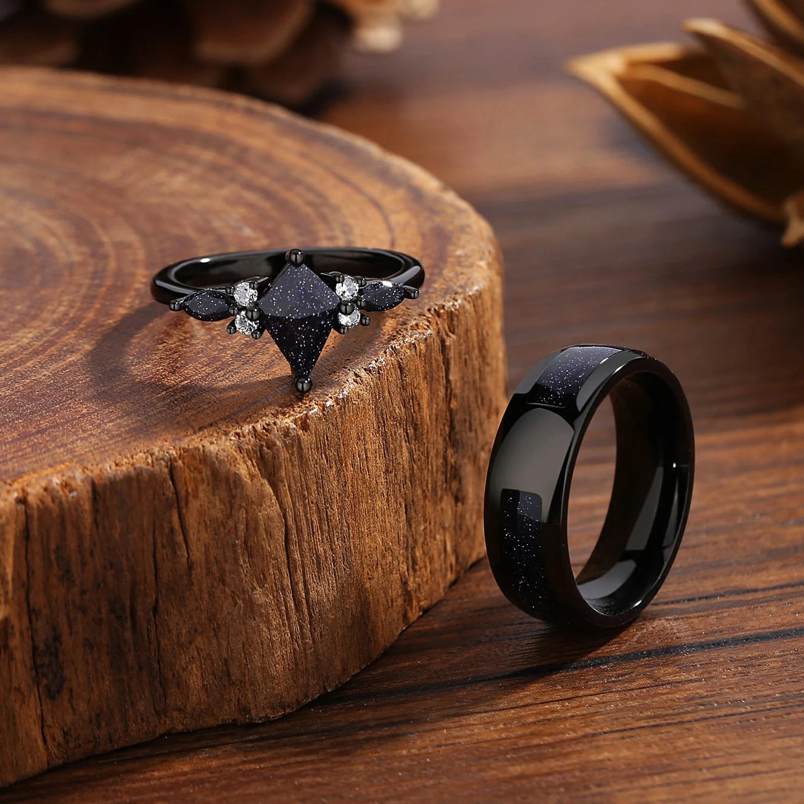Midnight Sparkle Couple Ring Set, Matching Promise Rings for Couples, Blue Sandstone Engagement Ring Anniversary Gift